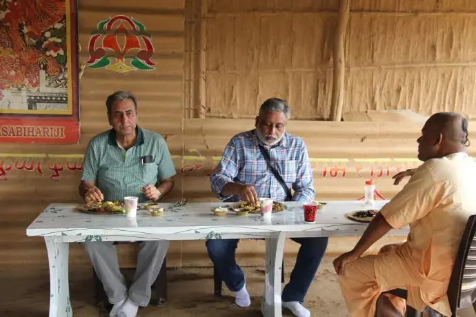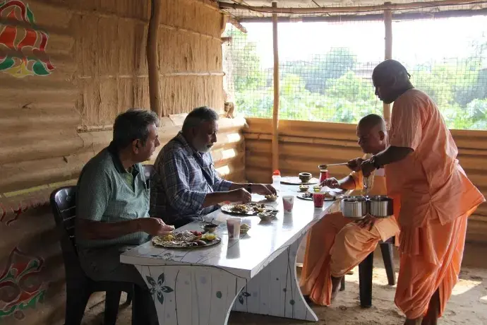 Pure vegetarian meals cooked using mostly locally grown vegetables, are served thrice a day. Milk, buttermilk and butter made from our cows are also served. Food is served either on banana leaves or plates made from other leaves.