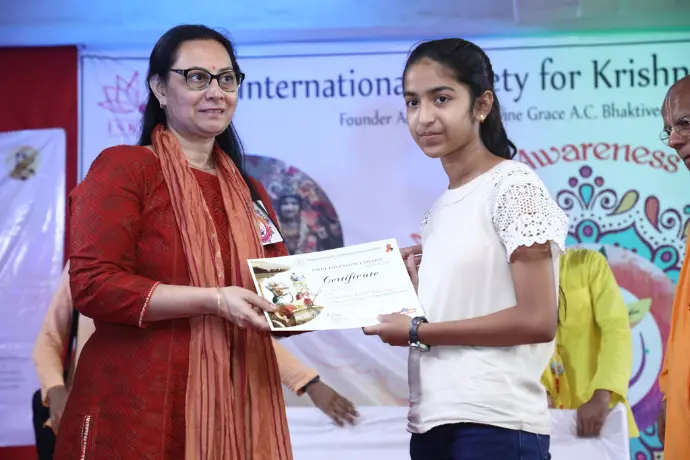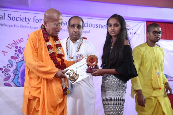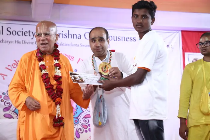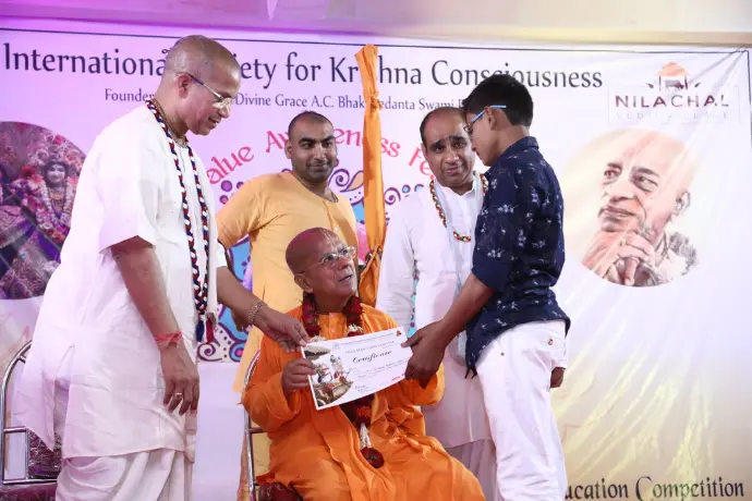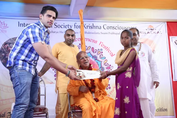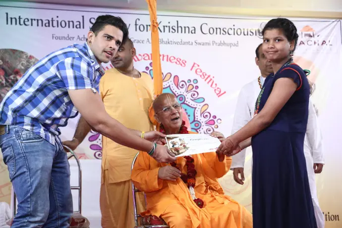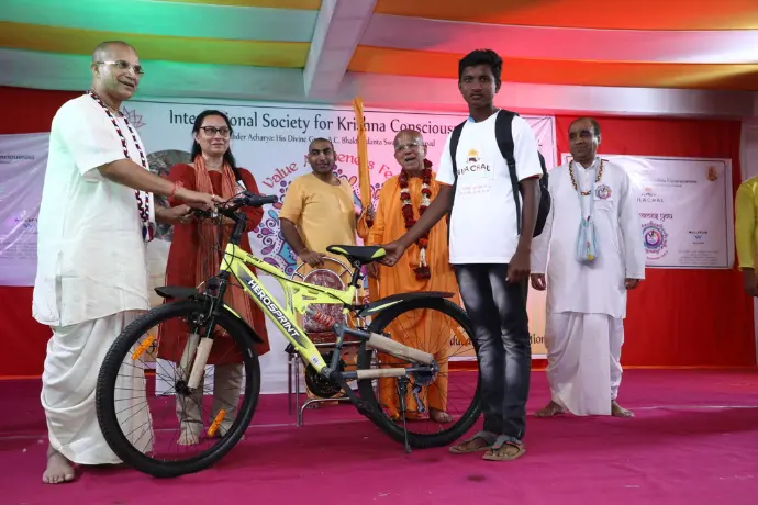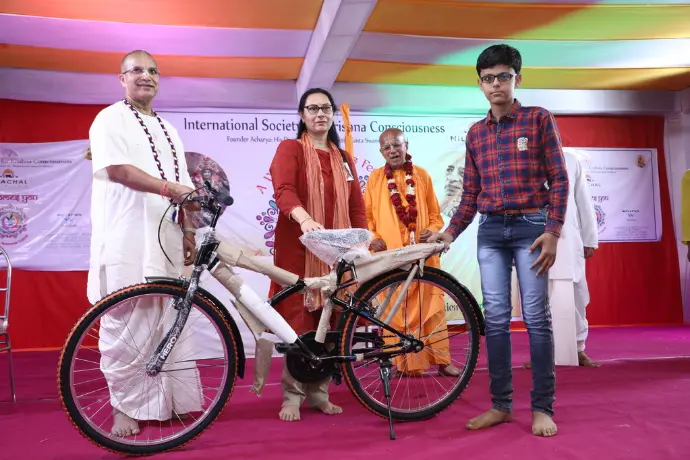 Prize distribution ceremony was during the Nilachal Utsav-2019. Two toppers from 8th to 9th grades were awarded bicycles. Same way two toppers from 5th to 7th grades were awarded bicycles. Bicycle with gear was awarded to first ranker and bicycle without gear was given to second ranker. All school topper praised with school bags and books based on value education. Chief guests for the prized distribution ceremony were HH Gopal Krishna Goswami (GBC-ISKCON & BBT Trustee), Sri LN Kaushik (President, Welspun Vapi), Sri Saurav Chakrabarti (Bollywood Actor), Sri Raj Logan (Bollywood Actor) and Madhav (Golly wood Actor).