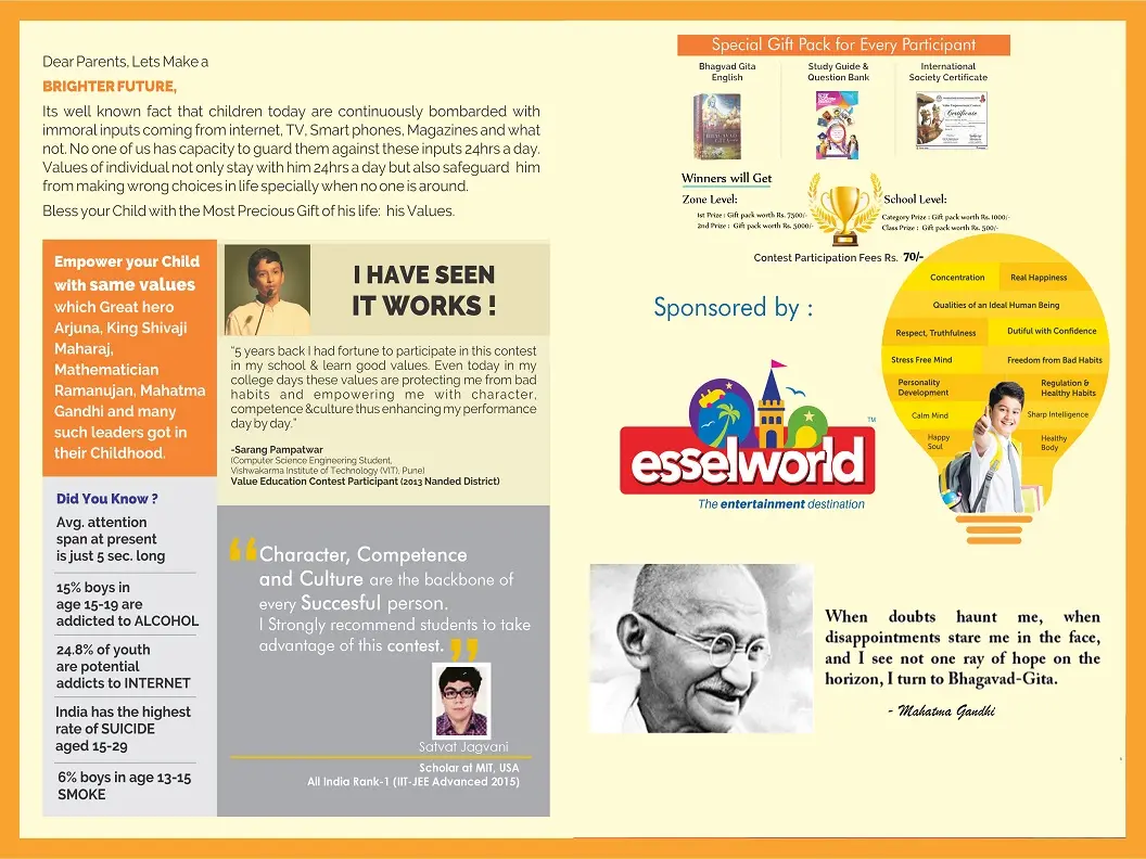 In the modern times of stress and competitive world it has become imperative to follow the principles of spiritual life. Too much exposure to television movies and Internet together drags the child easily towards the evils like violence obscenity and insanity. To keep a peaceful mind the seed of that peaceful life is sown at this tender age.