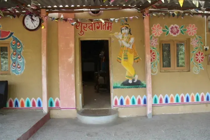 The Sri Sri Jagannath Baladeva Subhadra temple is constructed in traditional style with cow-dung smeared floors and walls. The wall paintings are inspired by the local art form known as Warli. This tribal art work offers the local people an opportunity to serve and earn while increasing the beauty and ethnicity of the walls. This temple was inaugurated in January 2012. Sri Sri Radha Banbihari and Sri Sri Gaur Nitaii are the other resident deities of this temple. The temple opens early in the morning at 5.00 am with mangal-arti up to 1.00 pm and again in the evening from 4.15pm to 8.30pm closing with the discourse on Bhagavad-Gita.